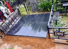 В завершении устанавливаем цветник, наполняем его каменной крошкой. Покрываем надписи на граните акриловой краской, которая сделает текст заметным во время дождя. Перед сдачей объекта клиенту проводим на участке влажную уборку. На последних фотографиях видно, что благодаря наземному покрытию место захоронения преобразилось до неузнаваемости.